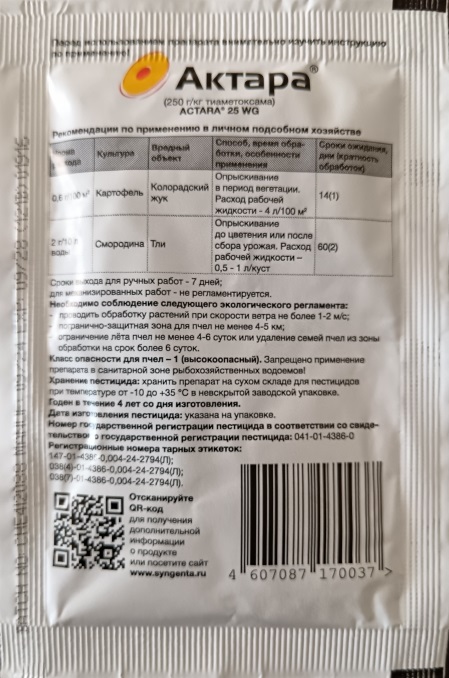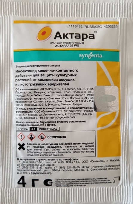 Если полить крупное растение, срок ожидания продвижения Актары составит — 2 суток. За это время активное вещество достигнет верхушки стебля, побегов. Препарат устойчив к солнечным лучам, сухому воздуху, дождю. Временной период защиты при опрыскивании составляет 15-25 суток. После полива в прикорневую зону — до 3 месяцев.
