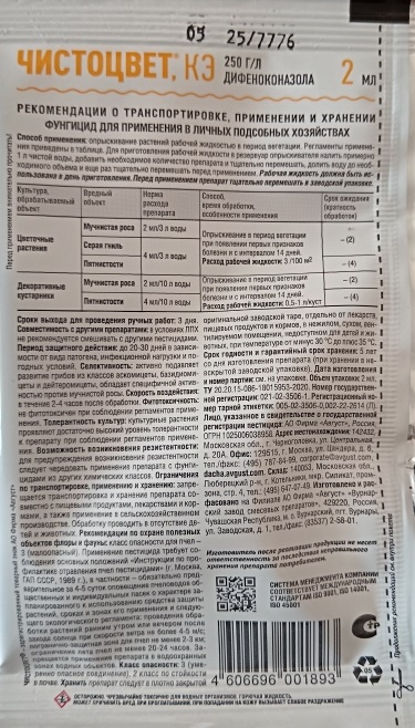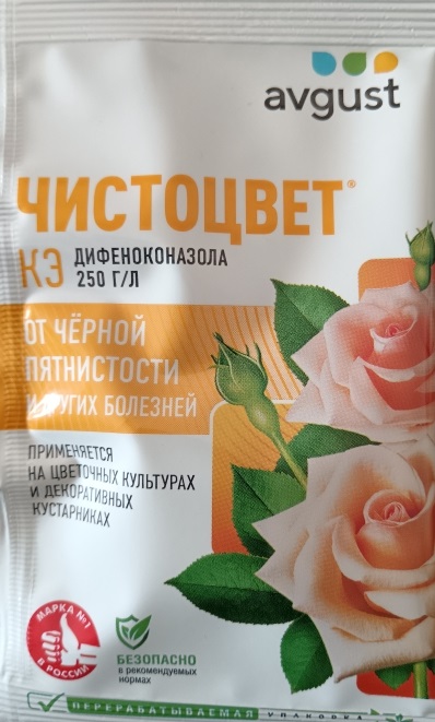 Препарат «Чистоцвет» относится к системным фунгицидам нового поколения. Его основным действующим веществом является дифеноконазол, позволяющий быстро справиться с болезнями даже в наиболее неблагоприятные сезоны.