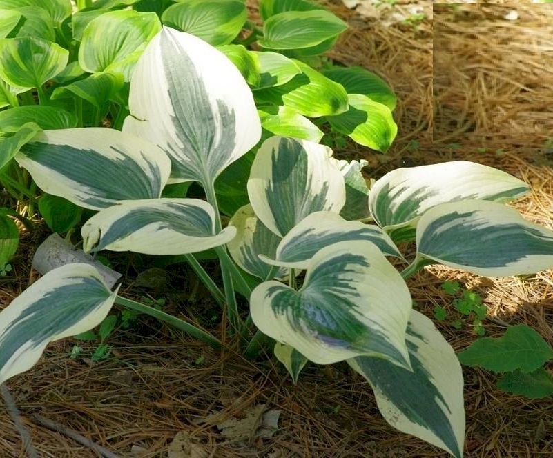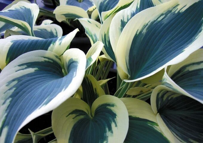 - Листья: голубые с изумрудным оттенком сердцевидной формы. Центр листовой пластинки сизый, кайма кремово-белая или желтая. К лету поля становятся белыми, а центр становится сине-зеленым.