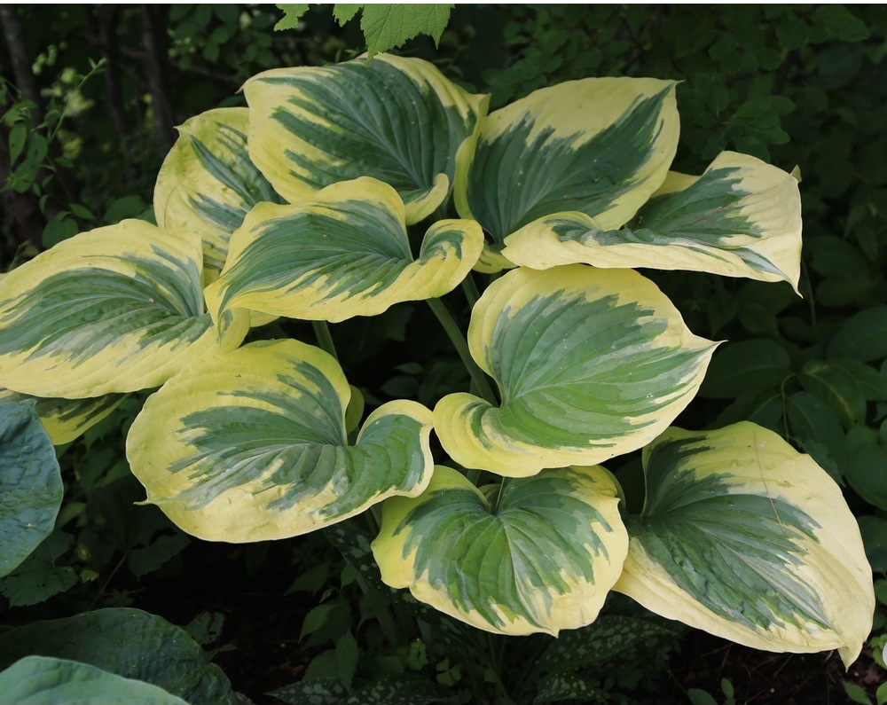 • Листья: большие сине-зеленые сердцевидные, окаймленные широкой кремово-белой полосой.