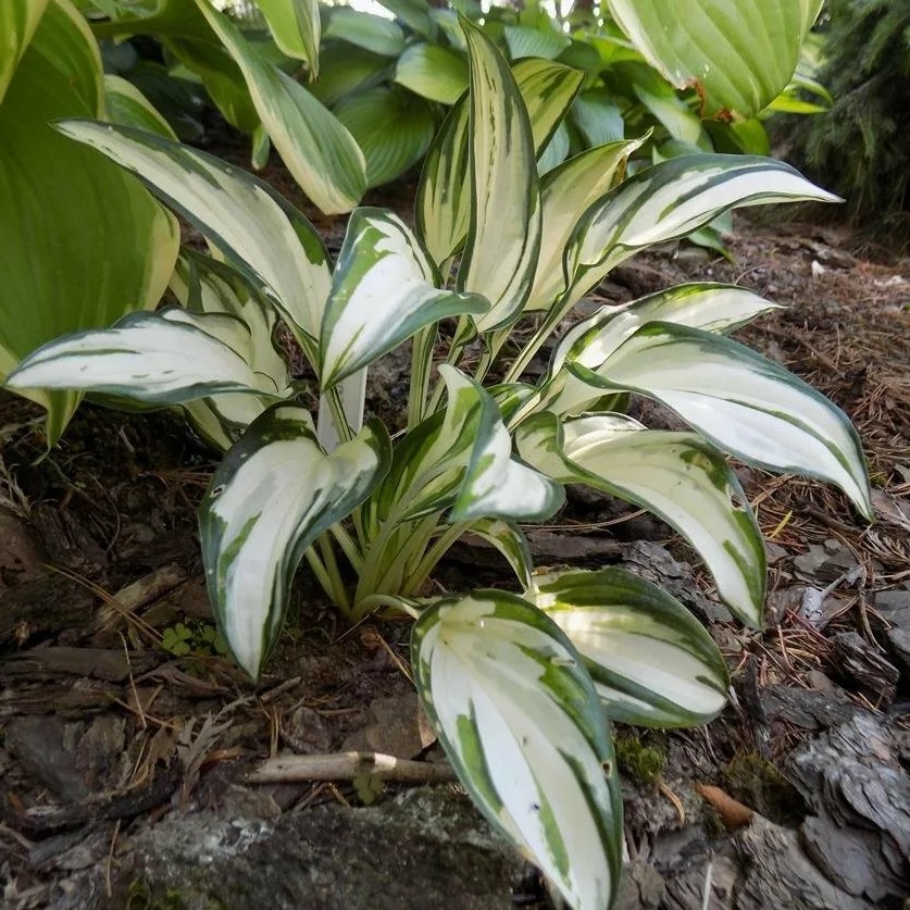 - Листья: имеют белый центр и неравномерные зеленоватые штрихи по центру и краям, что делает эту хосту очень декоративной. Край листа выглядит очень волнистым, а наличие зеленой каймы добавляет ещё большего изящества.