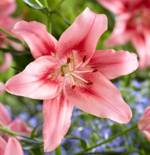 Группа: AOA-гибриды. Прекрасный сорт! Атласная поверхность лепестков выкрашена в элегантный розовый цвет, немного сгущающийся к горлу и украшенный мельчайшими крапинками-веснушками. Диаметр цветка 13-15 см. Из середины лилий выглядывают розовые тычинки, увенчанные темными коричневыми пыльниками. Высота: 90-110 см. Цветение июль-август.