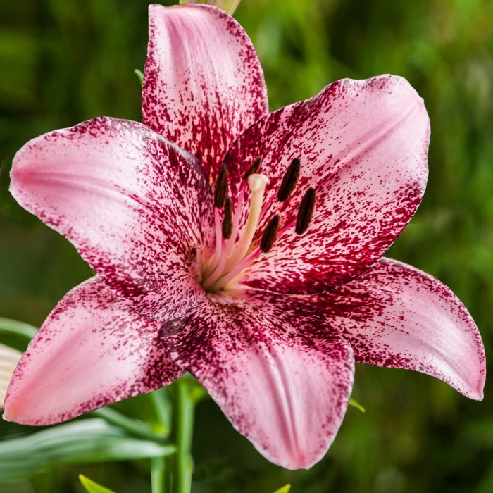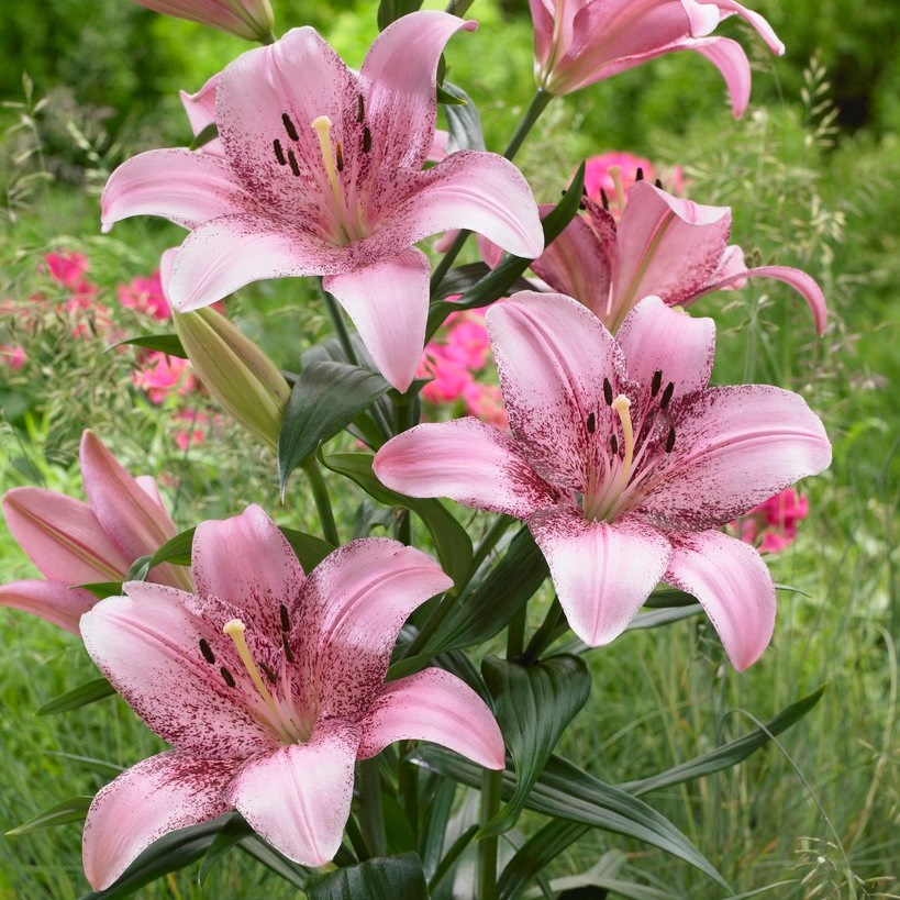 Группа ЛА-гибриды. Неприхотлива и простота в уходе. Но её простота совершенно не распространяется на прочие характеристики. Так цветок в диаметре 15-20 см. Форма его чашевидная, лепестки по центру имеют желобок. Приятен нежный розовый цвет бутона, серединка его с вишнёвым хаотичным напылением. Лилия достаточно высокая, длина стеблей 100-110 см. Цветение июль-август.