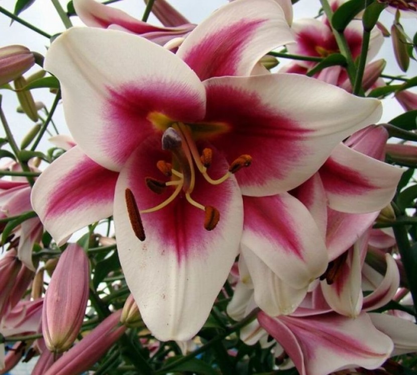 ОТ-гибриды – результат скрещивания Восточных и Трубчатых лилий. Побеги прочные, крепкие. Устойчивы к заболеваниям, морозостойки, но на зиму посадки рекомендуется мульчировать. Можно выращивать на одном месте без пересадки в течение 5 лет.