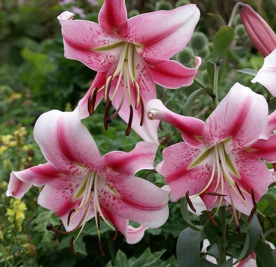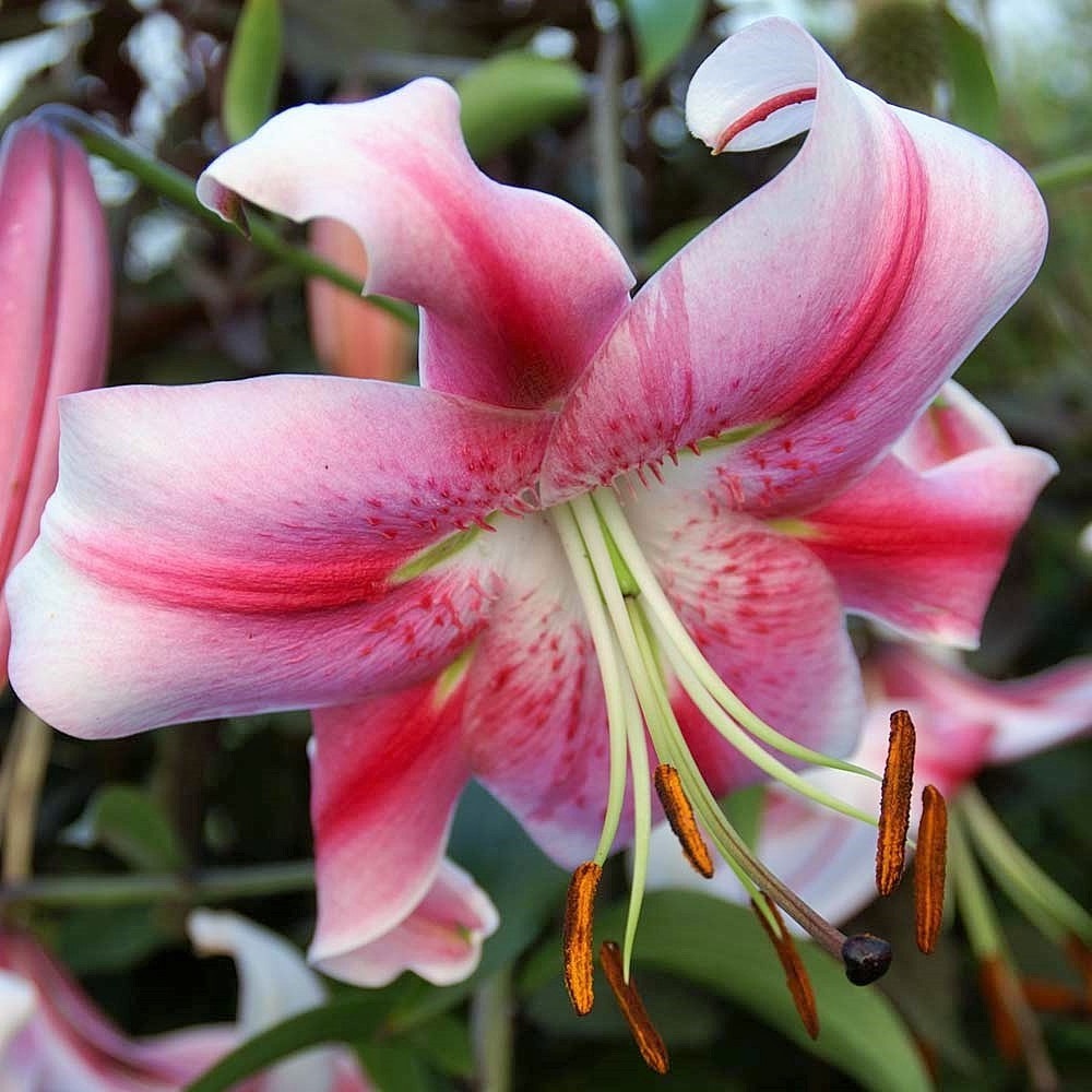 Состоят цветы лилии Анастасия из шести лепестков вытянутой треугольной формы. Сами лепестки имеют волнистые края и закручиваются кверху, открывая взору длинные желтые пыльники и коричневые нектарники. Последние очень эффектно смотрятся на розовом фоне с яркими малиновыми продольными полосками и штрихами. К краям лепестков яркость красок постепенно сходит до белых кремовых оттенков.