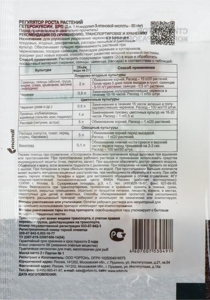 Черенкование плодовых, ягодных и декоративных культур — замачивание полуодревесневших черенков в течение 10-16 ч., зеленых черенков роз — в течение 16 ч. Расход препарата 4 г/л воды, расход рабочей жидкости — 1л/50 штук (1л/100 штук — для роз).