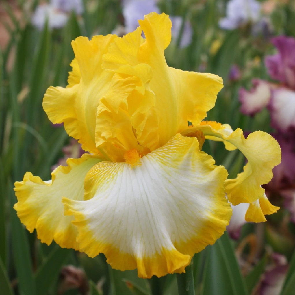 Ирис германский: Фриндж оф Голд группа: бородатые, среднерослые. Растение высотой 50-60 см. Листья широкие, линейные, сизо-зеленого оттенка, прекрасно сохраняют форму и декоративность в течении всего лета.