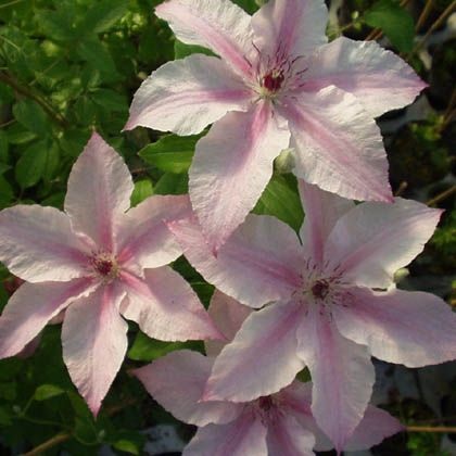 - Цветки: крупные, диаметром до 12 см. Лепестки немахровые, овально-заостренные, уложенные в аккуратную шестиконечную звезду. Окраска лепестков – бледно-розовая, с более темной продольной полосой. Полоса акварельная, не контрастная, почти исчезает к кончикам. Тычинки пушистые, темно-коричневые.