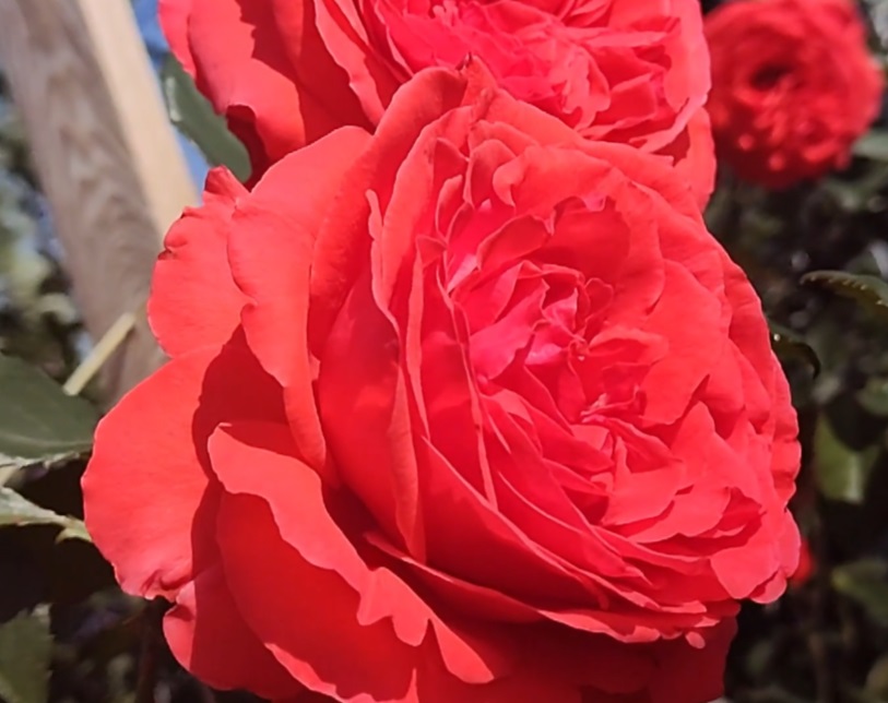 • Цветки: крупные, 9-11 см. в диаметре, чашевидной формы, густомахровые, до 70 лепестков. Окрас яркий – оранжево-красный. В роспуске к основному окрасу добавляются розовые и фиолетовые оттенки, что придает цветку невероятную экзотичность. Цветки располагаются в соцветиях 3-5 штук.