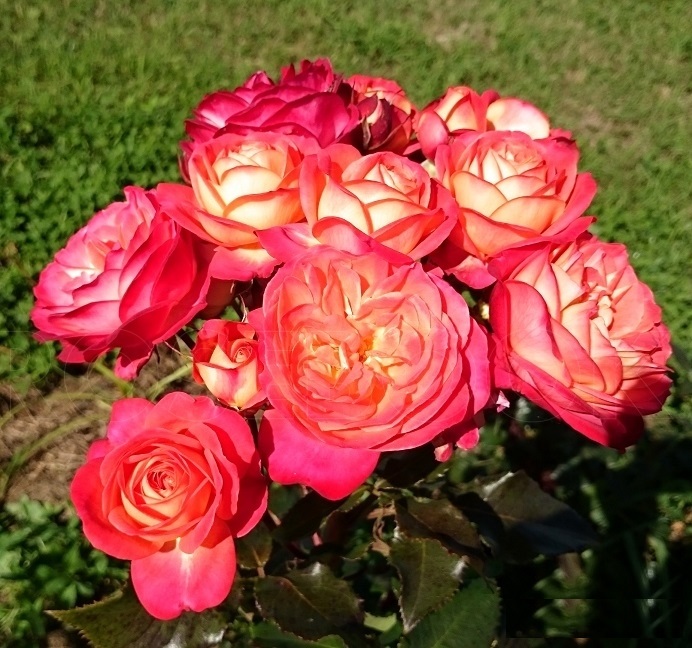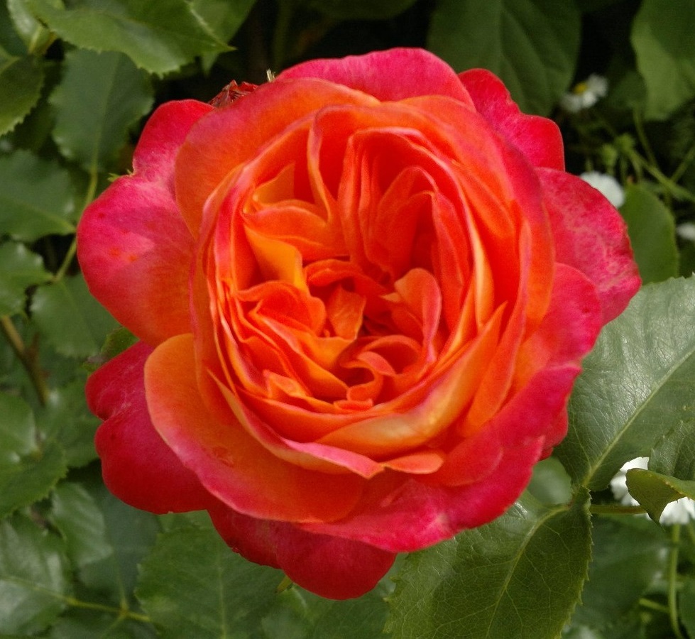 - Цветки: крупные, 6-8 см. в диаметре, густомахровые, до 40 лепестков. Форма может быть шаровидной или квартированной. Окрас цветка на протяжении цикла цветения меняется – от оранжево-красного с изнаночной желтой стороной до розово-красного с клубничными оттенками. Цветки располагаются в соцветиях по 3-5 штук.